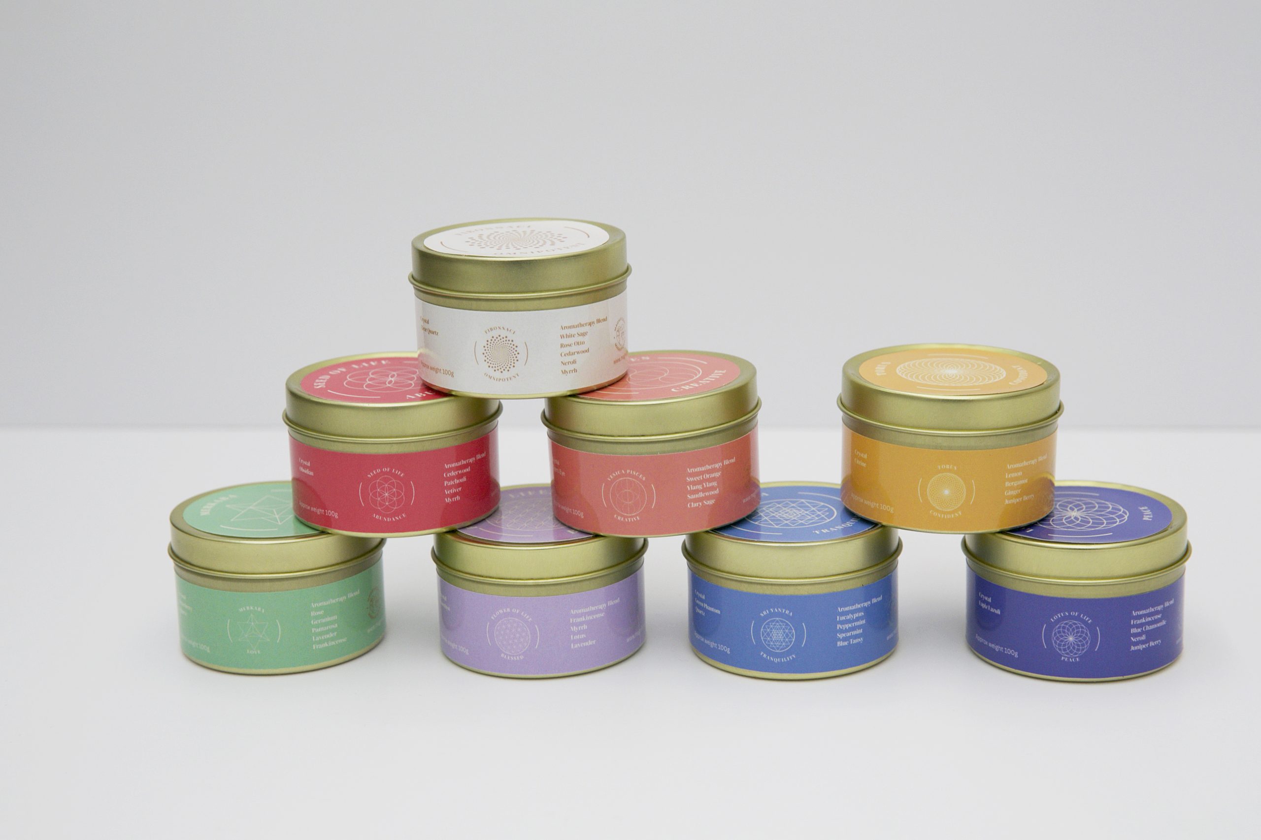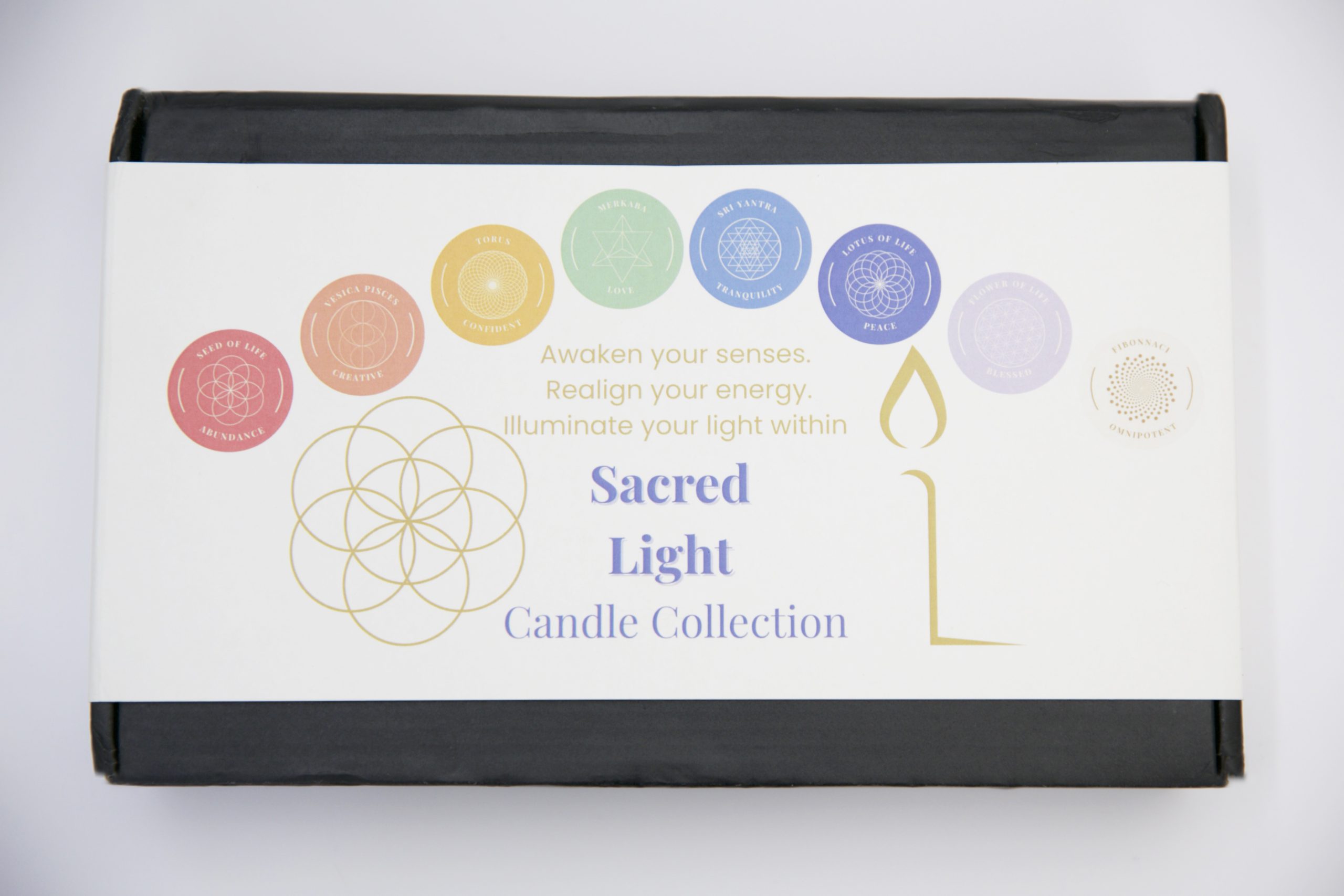 The Sacred Light Candle Collection, a mindful blend of Sacred Geometry, affirmations, colours, crystals and aromatherapy, in this beautifully designed gift box set of 8 individual unique candles.