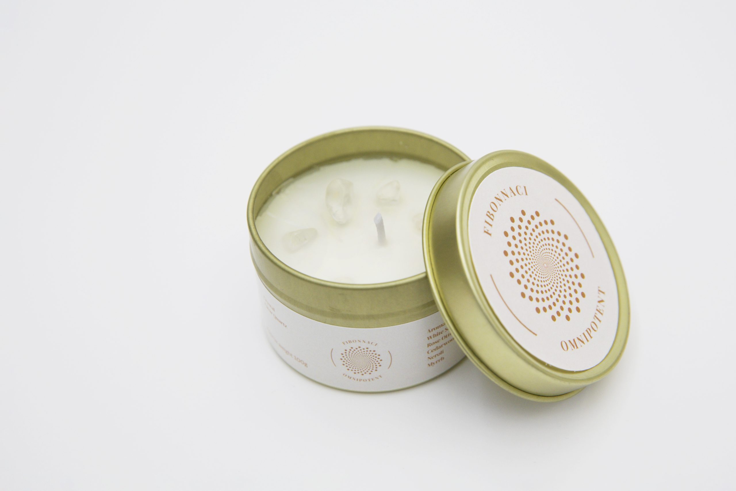 - White – Fibonnaci – Omnipotent, a blend of White Sage, Neroli, Myrrh, Cedarwood, Rose. Crystal – Clear Quartz