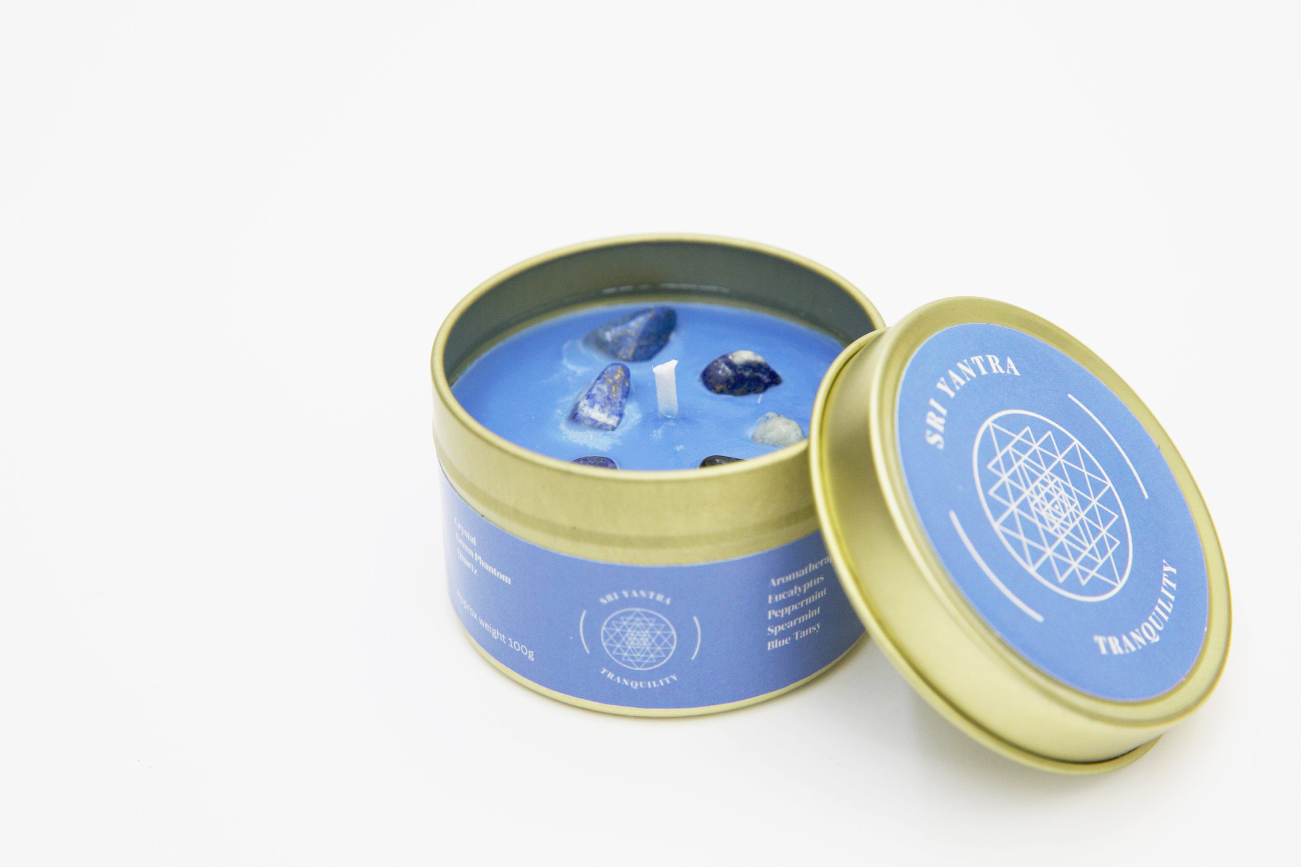 - Blue – Sri Yantra – Tranquility, a blend of Eucalyptus, Peppermint, Spearmint, Blue Tansy. Crystal – Green Phantom Quartz
