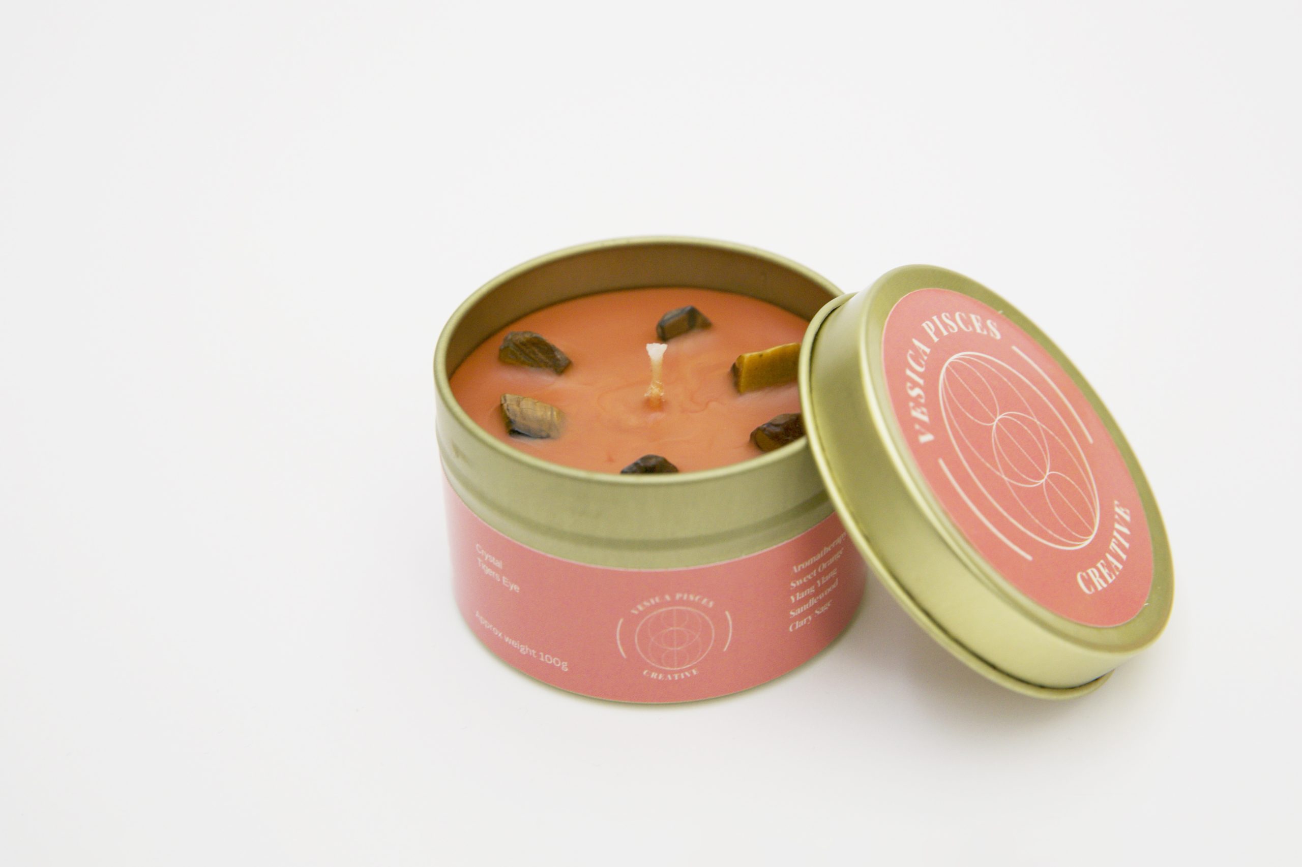 - Orange – Vesica Pisces – Creative, a blend of Sweet Orange, Ylang Ylang, Sandlewood, Clary Sage. Crystal – Tigers Eye